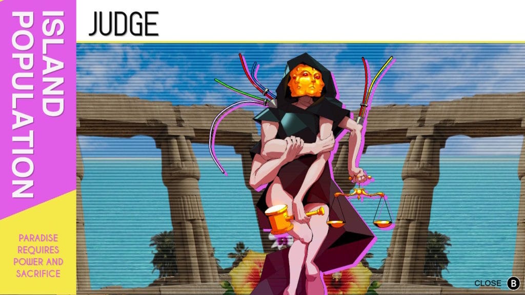 Love Dies and the Judge are both pillars of the Syndicate’s architecture of justice. The case stirs up a lot of old, bad blood, and I couldn’t help but think of how similar cases might have been handled in the past. (Especially given that third option, the gun option.) In giving the player these options, Paradise Killer demonstrates how judicial systems so often work to serve purposes aside from innocence and guilt. But you can do all that with a story set in a county courthouse in Arizona. What does Paradise bring to the table? Why make this a cosmic mystery?